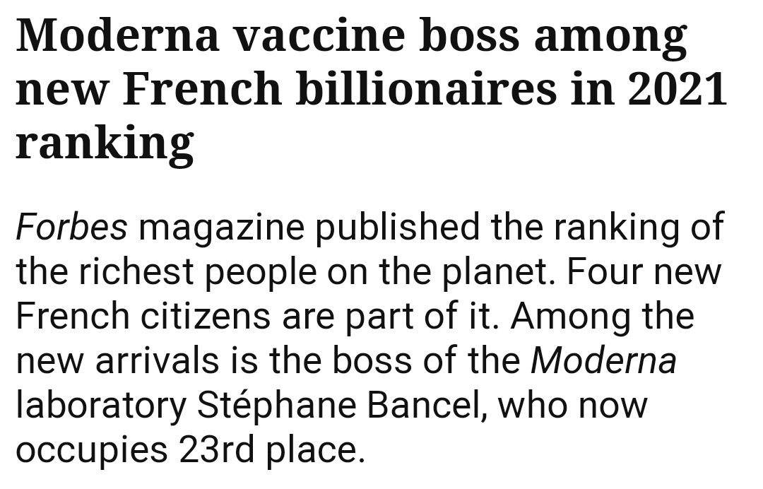 Intressant i sammanhanget är också att man i Forbes Magazine för 2021 års ranking över världens rikaste människor som lyckats bevara eller öka sin förmögenhet under Coronakrisen, hittar nykomlingen Stéphane Bancel, chef för American laboratory Moderna Therapeutics, där han innehar 8% av kapitalet. Med en förmögenhet på 4,3 miljarder dollar tillhör han en av de 25 mest förmögna personerna i Frankrike. Årets tre topplaceringar innehas dock av Jeff Bezos, Elon Musk och den franska miljardären Bernard Arnault.
