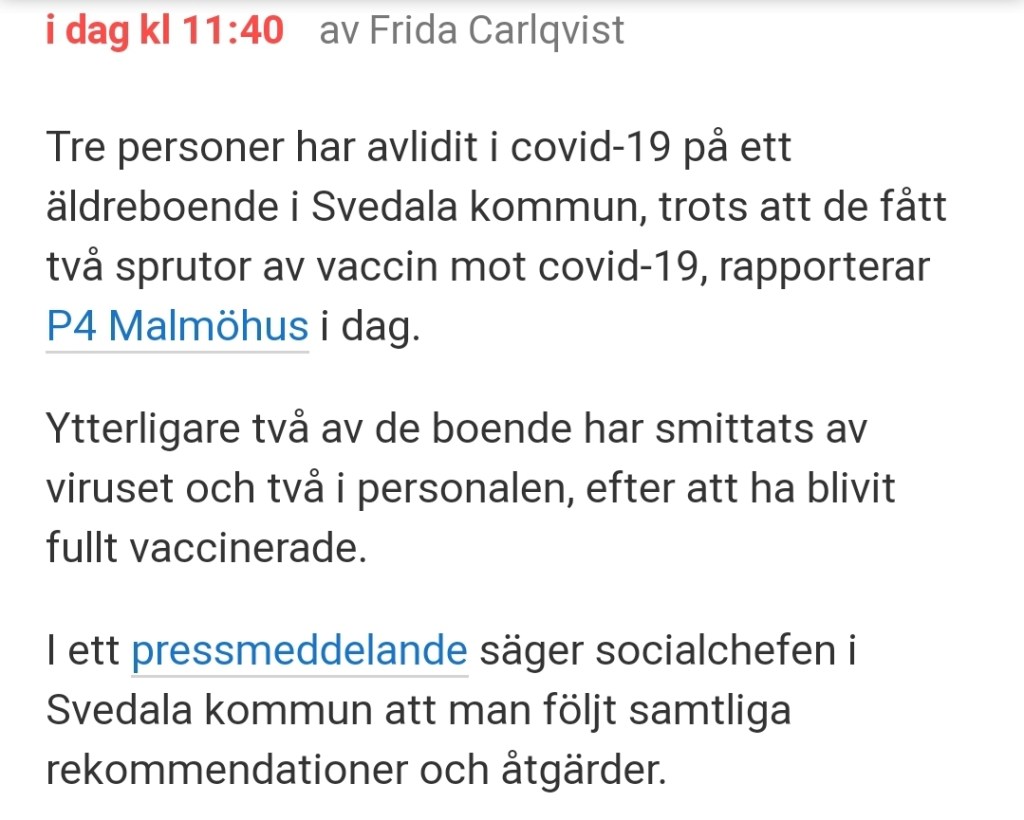 Nu tre döda på äldreboende i Svedala trots att de var fullvaccinerade. 🤔 Lagt in bild i inlägget.