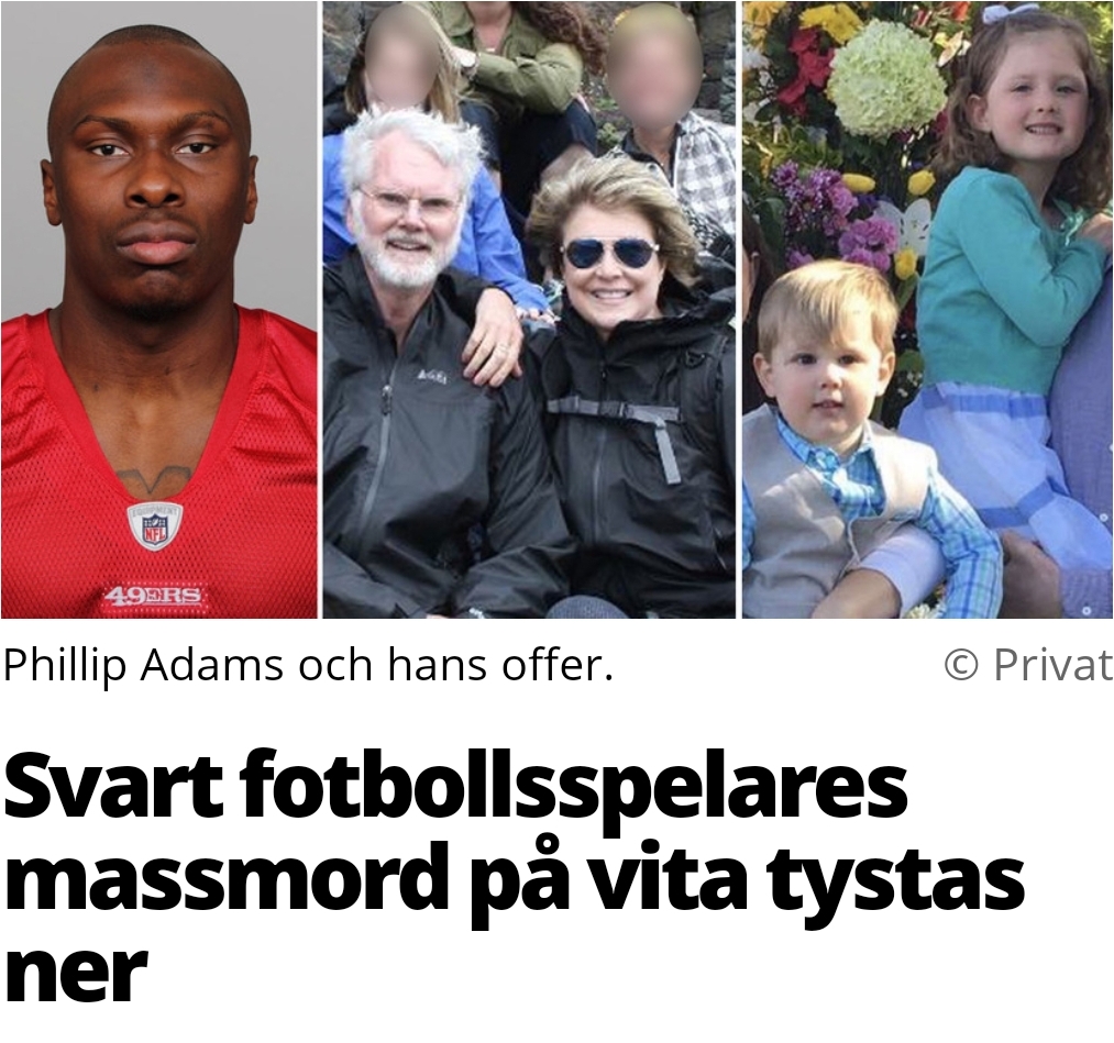 Noterar att den 70-årige läkaren Robert Lesslie, hans 69-årige hustru Barbara Lesslie och deras två barnbarn 9-åriga Adah Lesslie samt 5-årige Noah Lesslie blivit kallblodigt avrättade i Rock Hill i delstaten South Carolina i onsdags, men att det inte uppmärksammats i media. Kanske har det att göra med att Philip Adams, en svart tidigare professionell amerikansk fotbollsspelare, är mördaren? Adams hade varit patient hos Lesslie och han tog sitt eget liv efter dödsskjutningen.