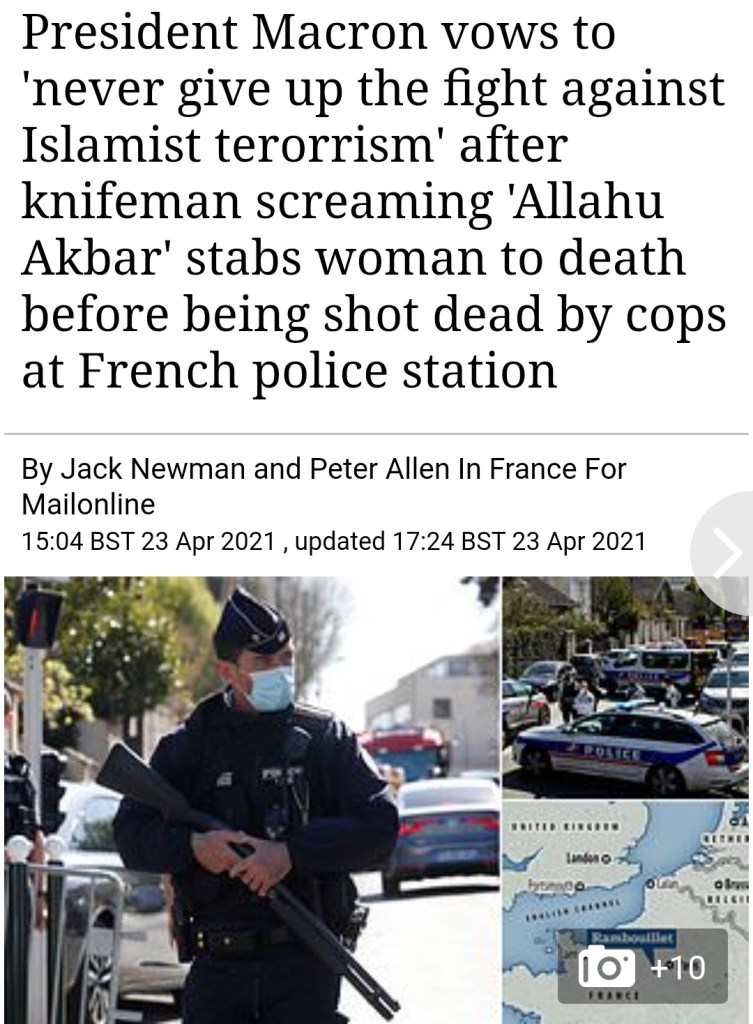 Mordet har fått Frankrikes president Macron att deklarera att ”I kampen mot den islamiska terrorismen viker vi oss inte en tum” och även den franska premiärministern samt inrikesministern har kritiserat den barbariska attacken, medan Macrons huvudmotståndare i nästa års presidentval Marine Le Pen, menar att det är nog nu och att fransmännen inte kan ta mer.
