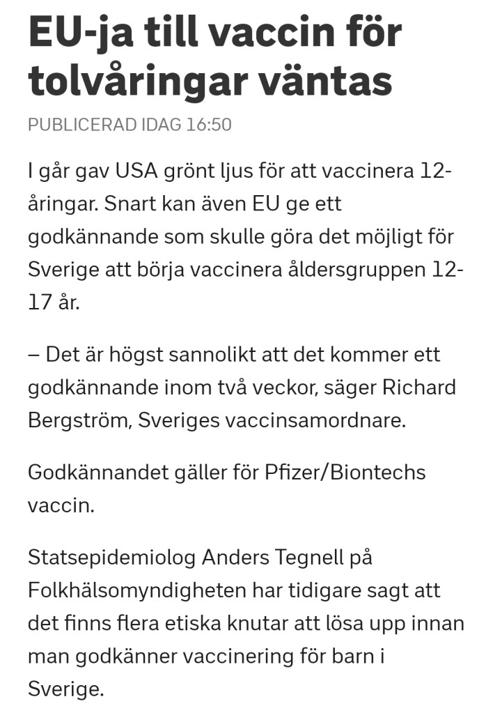 Enligt uppgift kommer även EU inom två veckor att godkänna vaccinering av åldersgruppen 12-17 år, vilket är helt befängt med tanke på att barn klarar sjukdomen mycket bättre än vuxna och antalet svårt sjuka samt avlidna barn torde vara nästan obefintlig.