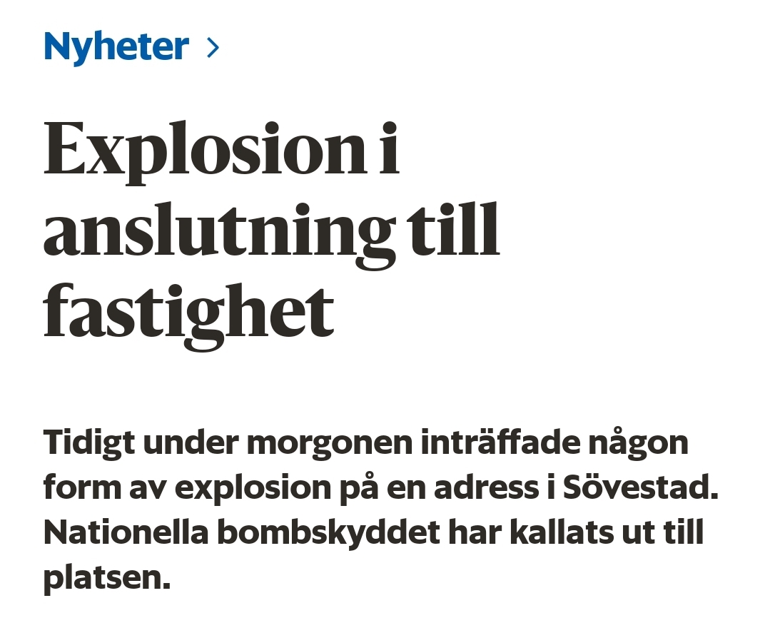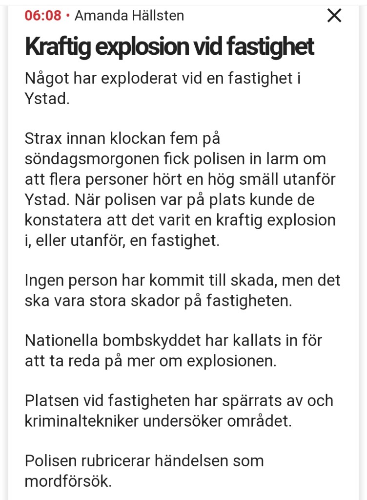 Vaknar till nyheten av att det skett en ”explosion” i min lilla byhåla som rubriceras som mordförsök och att nationella bombskyddet är på plats. Man tror inte sina ögon, men det är ett tydligt bevis på att det grova våldet sprider sig i landet och inget område är säkert. En bekant som bor på gatan där det smällde berättar att hon vaknade av att huset skakade och sängen lyfte. De två barnfamiljerna som bor på den drabbade adressen befann sig där när explosionen inträffade, men klarade sig dock utan skador.