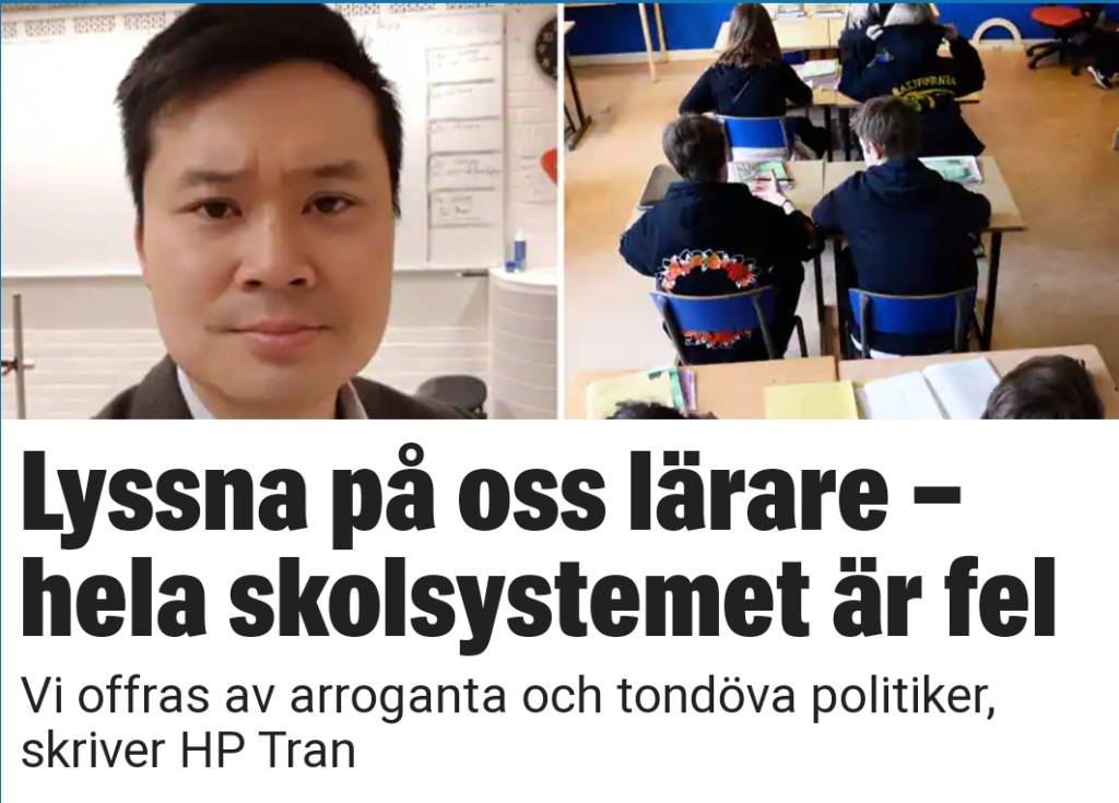 Läraren HP Tran skriver en engagerande text i dagens Expressen där han tar upp de största felen med den svenska skolan som numera är i fritt fall efter att ha negligerats i decennier. Det är tydligt att våra makthavare varken har intresse eller drivet att rädda denna fundamental samhällsfunktion,