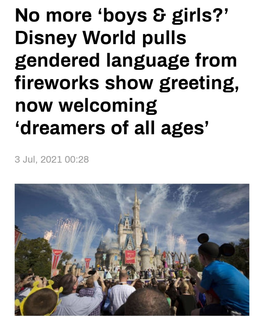 Disneys temapark i Florida har nämligen hakat på den politiskt korrekta könstrenden för att bli mer ”inkluderande” och tagit bort alla ord med könstillhörighet i den förinspelade presentationen av fyrverkerishowen i Magic Kingdom.