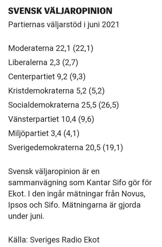 Väljaropinionen för juni talar dessutom sitt tydliga språk och det var därför Socialdemokraterna till varje pris ville undvika ett nyval genom att agera dörrmatta åt V, C och Amineh Kakabaveh – Miljöpartiet skulle nämligen följa med Liberalerna i avloppsvattnet ut från riksdagen och inte längre kunna rädda kvar S vid makten om folket fått bestämma.