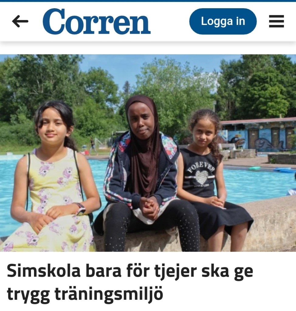 Fick syn på denna låsta artikel i Östgötakorrespondenten som skriver om att man i år för första gången anordnar simskola på Glyttinge för enbart flickor med målet att flickorna ska bli trygga i vattnet. Ja pojkar är så busiga ni vet… Men en anblick av bilden ger vid hand vad den riktiga anledningen till denna könsuppdelning är, nämligen att flickor från vissa kulturer där det täcka könet inte får visa varken hår eller hud samt där det anses oanständigt för flickor att umgås med pojkar, måste ha egna grupper för att kunna lära sig simma.