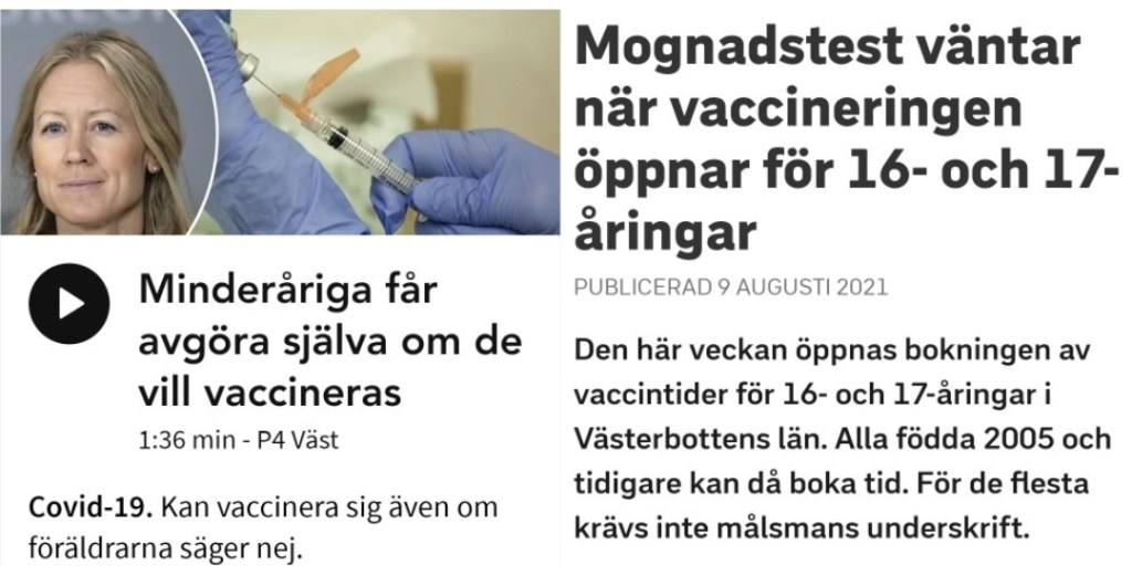 Från och med den 11 augusti får 16- och 17-åringar i Västra Götaland boka in sig för vaccinering mot Covid-19 trots att de är omyndiga. Här är det nämligen upp till barnen själva om de vill ta vaccinet eller ej och det är barnets vilja som gäller. I Västerbotten kör man med mognadstest istället för att låta föräldrarna bestämma över sina omyndiga barn.