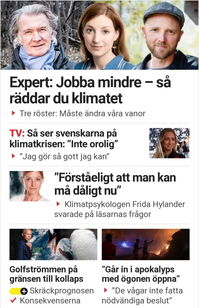 Jag läser utländsk media dagligen och kan med lätthet konstatera att klimatångesten, klimathysterin samt det evinnerliga tjatet om klimatnödläget är ett lokalt svenskt problem. Ingen annanstans fylls tablåerna med så mycket propaganda i detta ämne som i det lilla kungariket i norr där det kuvade folket gladeligen suger i sig allt som mainstream media serverar utan varken eftertanke eller ifrågasättande. När det däremot är rekordkallt och mycket snö är hycklarna tysta eftersom det inte passar deras narrativ om de farligt varma temperaturerna som hotar allt existentiellt liv i syfte att skrämma människor för att kunna genomföra den politiska agendan.