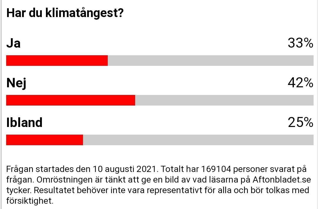 Det ger dock en viss tillfredsställelse att se att Aftonbladets undersökning där man frågar om folk lider av klimatångest, inte gett ett rungande ja varken i går eller i dag. Det inger ett visst hopp om att folk ännu inte helt slutat tänka själva.