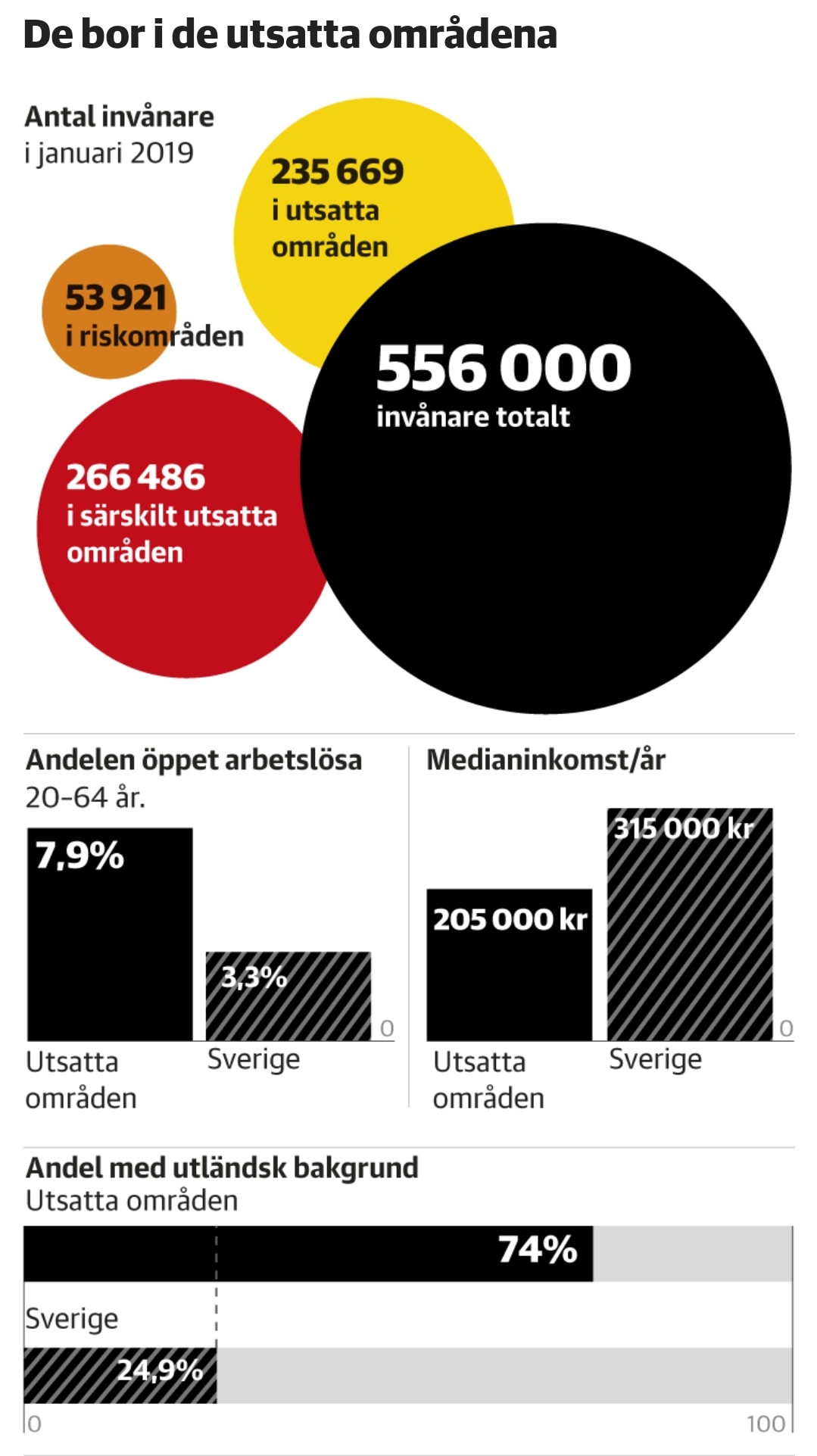 Man går som katten runt het gröt i denna DN-artikel. Inte en stavelse, inte ett ord om vad som skulle göra skillnad på riktigt. Dessa så kallade utsatta områden var inte utsatta innan de blev bebodda av skamlösa invandrare. Så hur ska dessa områden bli icke utsatta? Svaret torde vara givet för var och en som kan lägga ihop 1+1 men det vågar inte politiker, polis eller media ens andas om. De som har rest hit kan såklart resa i andra riktningen, antingen frivilligt eller med tvång.