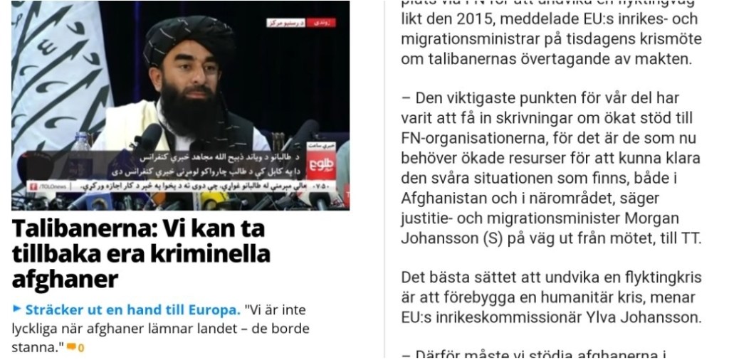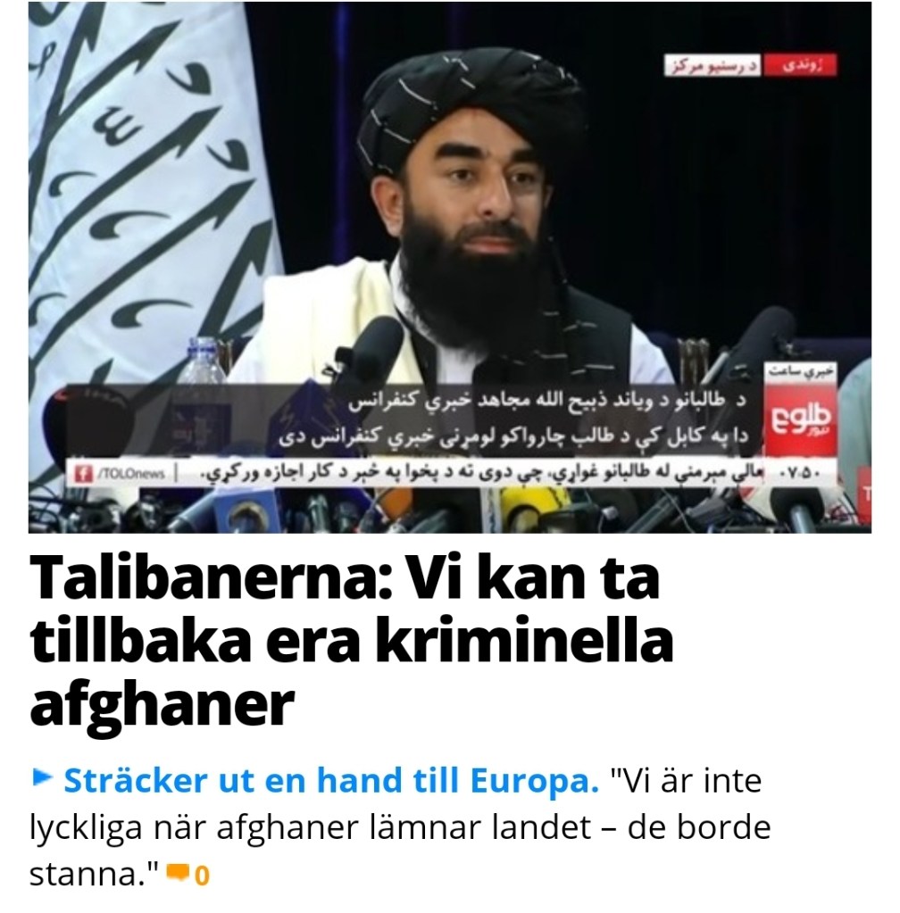 En god nyhet i sammanhanget är dock att Talibanerna nu ger klartecken för att ta emot sina medborgare – inklusive brottsdömda – som utvisats från andra länder. Det var Talibanernas talesperson Zabihullah Mujahid som tidigare i dag uppgav att regeringen i Afghanistan nu är redo att ta tillbaka afghaner från Europa – man vill särskilt att de unga ska stanna kvar och hjälpa till att bygga upp landet.