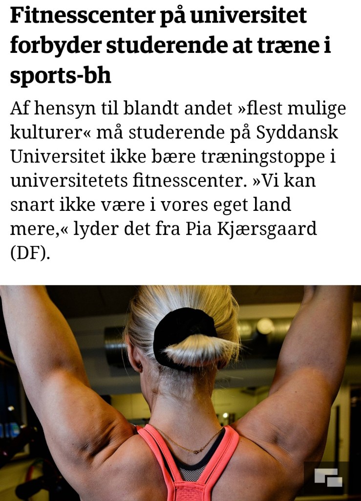 Noterar som hastigast att Syddansk Universitet i Danmark tagit ett märkligt beslut. Universitetets fitnesscenter, SDU Fitness, har nämligen förbjudit elever att träna i sport-BH/träningstopp av hänsyn till andra kulturer. Beslutet har väckt massiva interna protester och nu har även flera Folketingspolitiker reagerat.