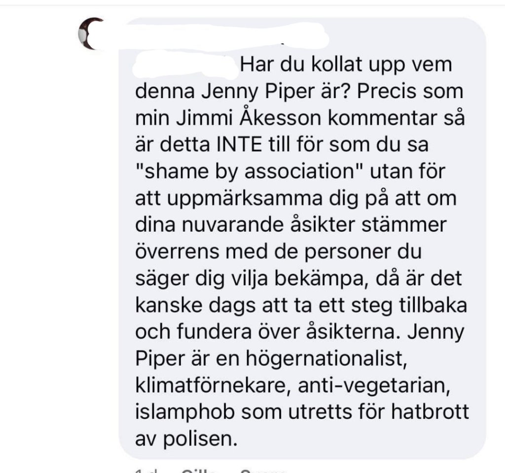 ”Hej Jenny. Jag läste en artickel i Ystads allehandla om att du var klimatförnekare. Jag inser nu att jag begått ett misstag och att artickeln var skriven av en annan person och att mitt påstående om dig som klimatförnekare var förhastad. Snarare uppfattar jag din ståndpunkt som att du anser att andra länder bör göra mer än Sverige (tex Kina). Jag må även ha varit förhastad i ett så pass stakt påstående som att du ÄR islamphob, en mer nyanserat påstående kanske hade varit på sin plats i att jag tycker det framstår för mig som att dina åsikter om muslimer är enligt mig drar åt ett håll som bidrar till att inte motverka islamophobi i samhället.