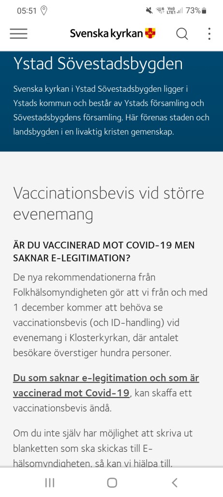 Ogenomtänkt att det enbart är ok för vaccinerade att tränga ihop sig i kyrkbänkarna eftersom de också är potentiella smittbärare. Jag hade förväntat mig fler protester från Svenska kyrkans sida eftersom de i regel propagerar för att alla är välkomna i guds hus, men tydligen är det ett vi-och-dem-samhälle som man vill ha.