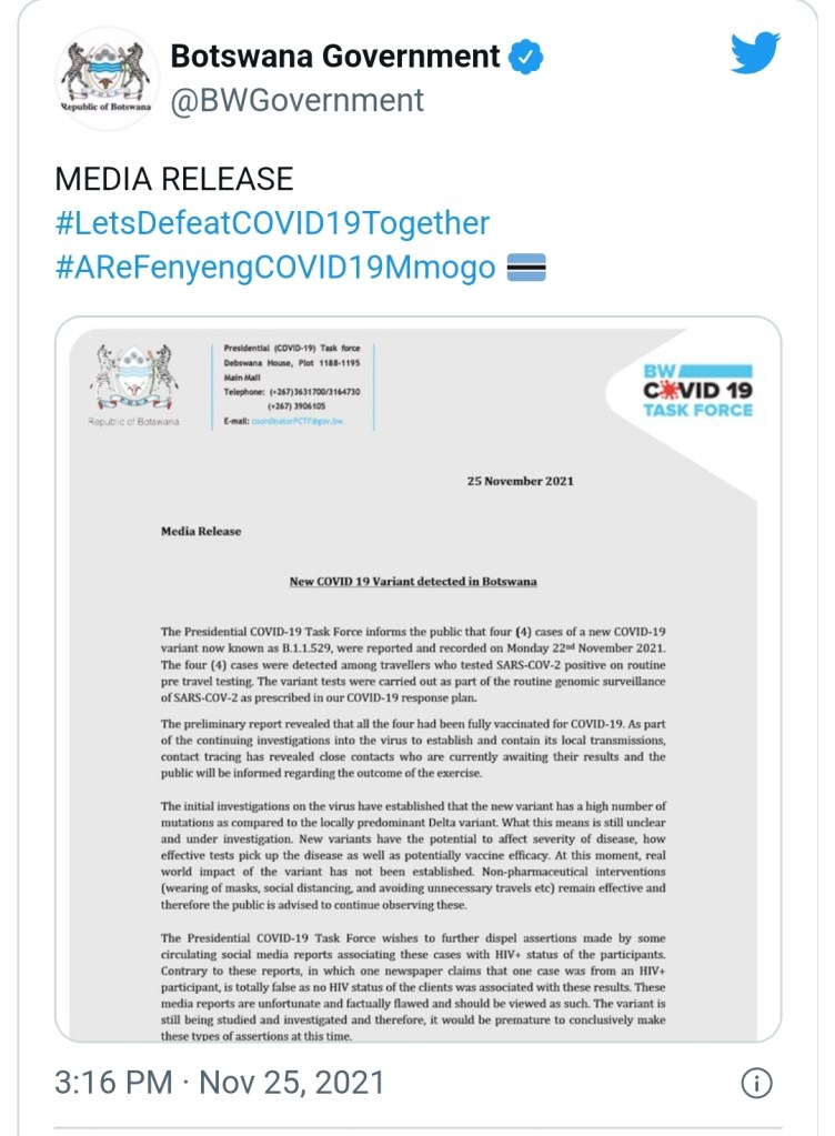 De fyra individer som först infekterades med den nya mutationen var utländska fullvaccinerade diplomater enligt den Botswanska regeringen och de som haft nära kontakt med de individer som infekterats hade inga Covid-19-symptom samt har testat negativt för covid.
