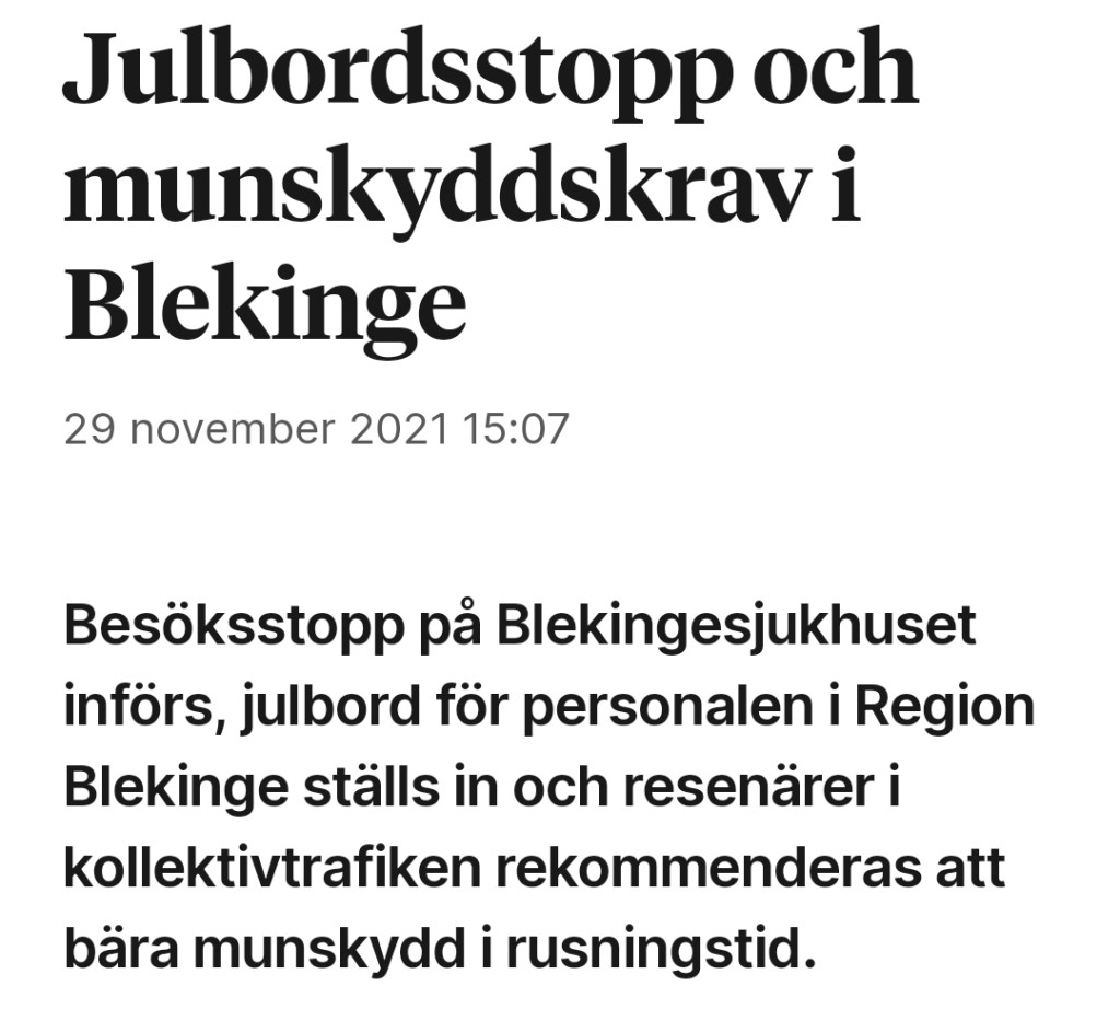 I Region Blekinge har man dock redan smygstartat och bland annat infört besöksstopp på sjukhusen, munskyddsrekommendationer i kollektivtrafiken och man ställer även in vårdpersonalens julbord så att de stackare som kämpat hela året inte ens får ta del av den årliga höjdpunkten. Men mest iögonfallande av allt är nog att man som första region i landet inför vaccinkrav för nyanställda.