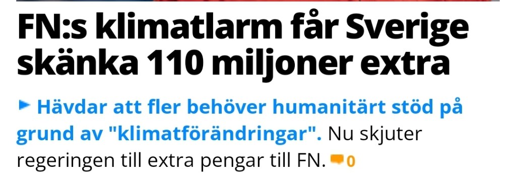 Sverige, landet där det finns outtömliga ekonomiska resurser till allt utom det egna folkets behov. I dag blev vi återigen varse om hur våra makthavare slösar med skattemedel i och med att den S-märkta regeringen beslutat om att skjuta till ytterligare 110 miljoner skattekronor till FN som hävdar att mer pengar behövs för att att möta de ökade humanitära behoven i världen – bland annat på grund av ”klimatet”.
