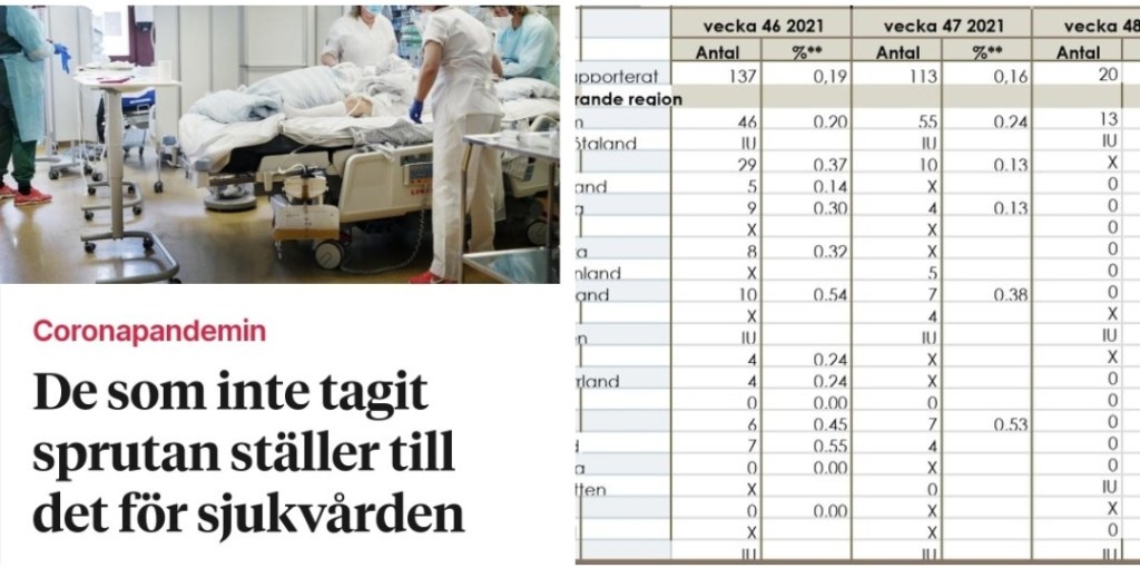 Tittar man på siffrorna över antalet inlagda patienter i slutenvården med Covid-19, ser man direkt att det inte är särskilt många patienter och då har det inte specificerats varken hur många av dessa som är ovaccinerade respektive vaccinerade eller har underliggande sjukdomar alternativt tillhör riskgrupp.