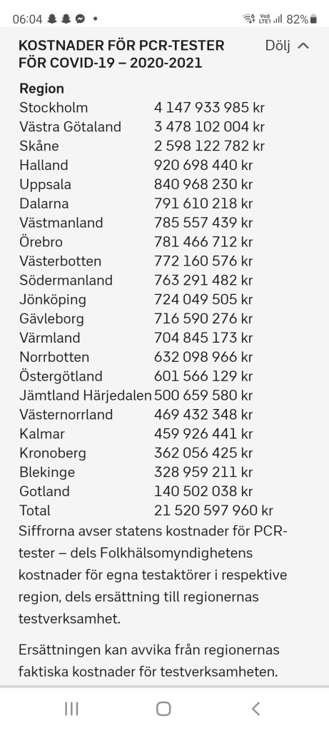 Att den samlade kostnaden för covidtesterna i Sverige är skyhög (över 21 miljarder kronor) har jag tidigare skrivit om och i dagens SVT Nyheter konstaterar man att prislappen för PCR-tester i enbart Region Sörmland uppgår till 750 miljoner kronor. Vaccinsamordnaren Magnus Johansson menar att stödet från staten som tagit kostnaden har varit avgörande.
