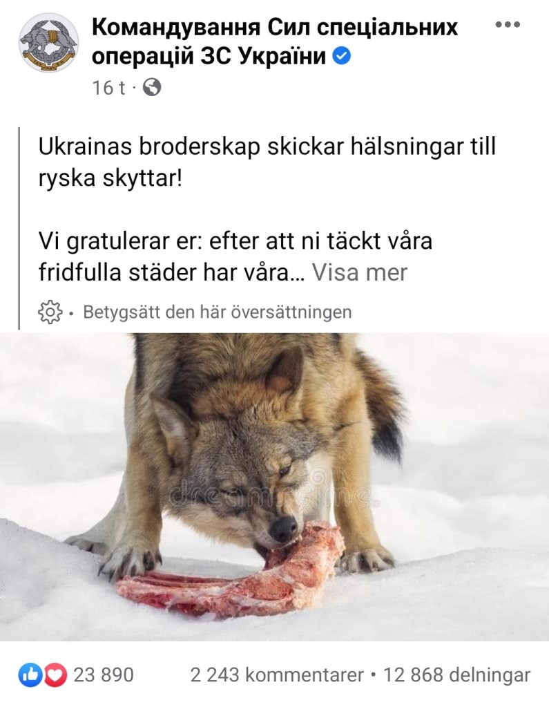 Enligt Kiev Independent tillkännagav den ukrainska försvarsmakten i går kväll att man nu kommer börja avrätta ryska krigsfångar genom ett officiellt meddelande på Facebook som fått över 20.000 gilla-markeringar och man skickar samtidigt ett provokativt formulerat budskap till ryska soldater: ”Från och med nu kommer det inte bli några fler tillfångatagna ryska artillerisoldater, så varje militär, vare sig ni är förare, befälhavare eller lastare, kommer att slaktas som grisar. Kissa på er, för vi kommer efter er. Ring din mamma och meddela att du kommer dö. Vi är inte döden, vi är värre! Att be om nåd eller säga ”snälla döda inte, jag ger upp” kommer inte att fungera längre”.