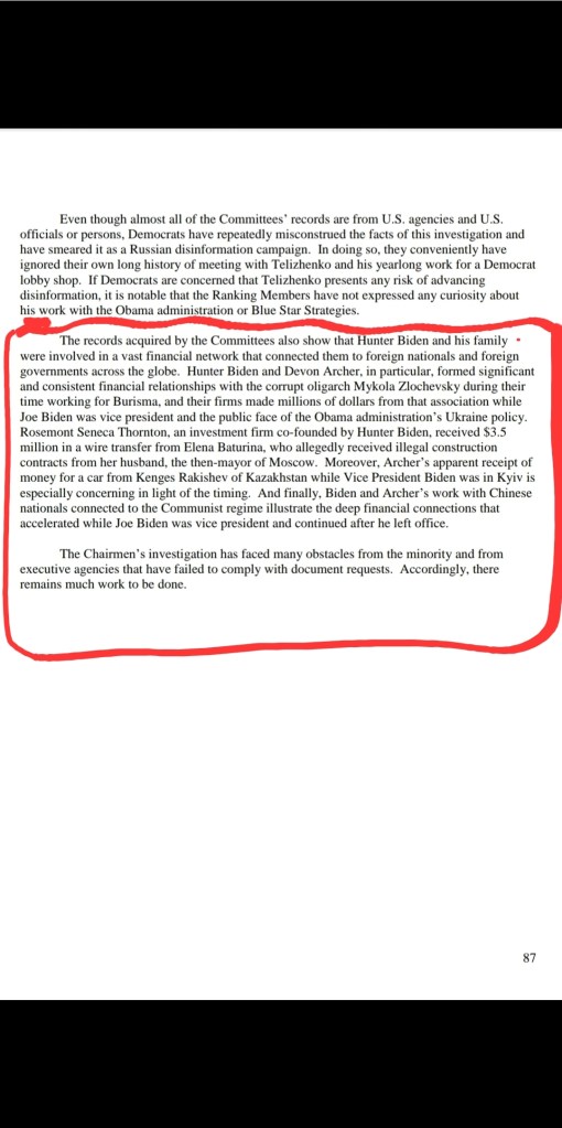 Familjen Bidens inblandning i korruptionsskandalen i Ukraina är en av alla saker vi inte pratar om eftersom media har lagt locket på, men vartefter rättegången mot Hunter Biden fortgår kommer det fram mer och mer smutsiga detaljer som sätter såväl far som son på pottkanten. Lustigt att de dessutom avslutar sammanfattningen av ett 87 sidor långt dokument med att det finns mer att utreda.