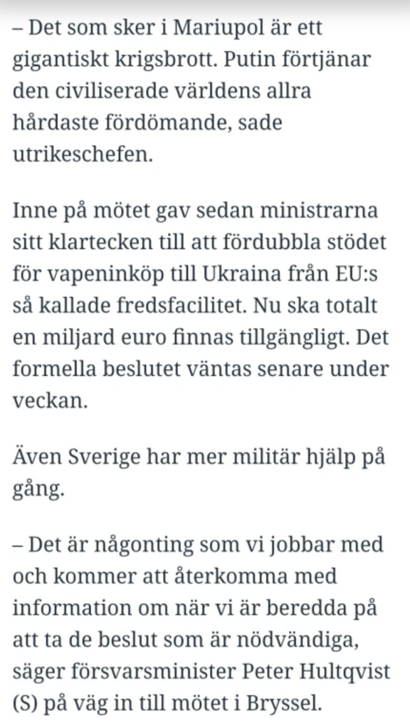 Även Sverige har mer militär hjälp på gång som man jobbar med enligt försvarsminister Peter Hultqvist (S). Utrikesminister Ann Linde säger sig dessutom inte ha något emot ett totalstopp för import av rysk energi. Känns skönt att ha ansvarstagande ministrar som håller i taktpinnen!