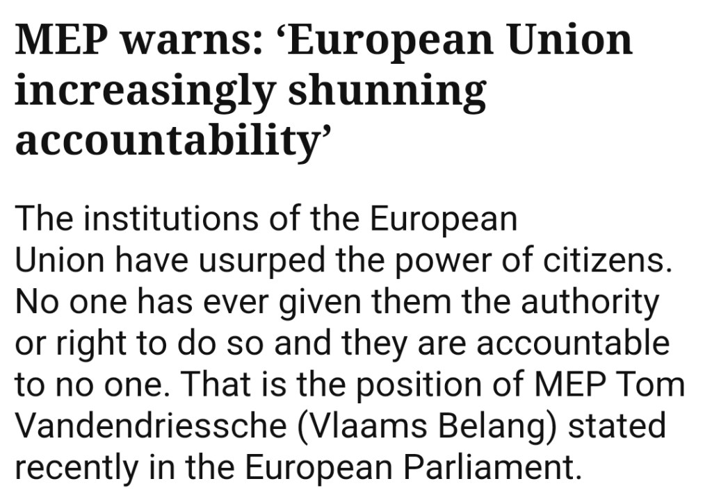 Att EU-ledamöterna själva kritiserar organisationen hör väl inte till vanligheterna, men MEP Tom Vandendriessche (Vlaams Belang) sade många bra saker när han häromdagen påpekade att den europeiska unionens institutioner har tillskansat sig medborgarnas makt som de varken har auktoritet eller rätt att göra samtidigt som de inte är ansvariga inför någon.