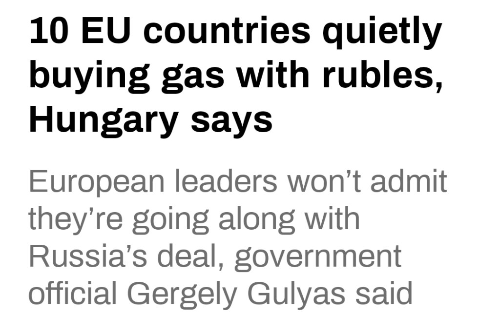 Denna varning verkar dock inte ha fått effekt för enligt den ungerska tjänstemannen Gergely Gulyas (premiärminister Viktor Orbans stabschef) som i dag intervjuades i offentlig radio, har flera europeiska ledare offentligt proklamerat att de inte kommer att köpa rysk gas i rubel som Rysslands president Vladimir Putin har krävt. Men ändock går 10 EU-länder tekniskt sett med på Putins plan. Enligt Gulyas anser inte dessa länders ledare att ”en bra europé” går med på detta.