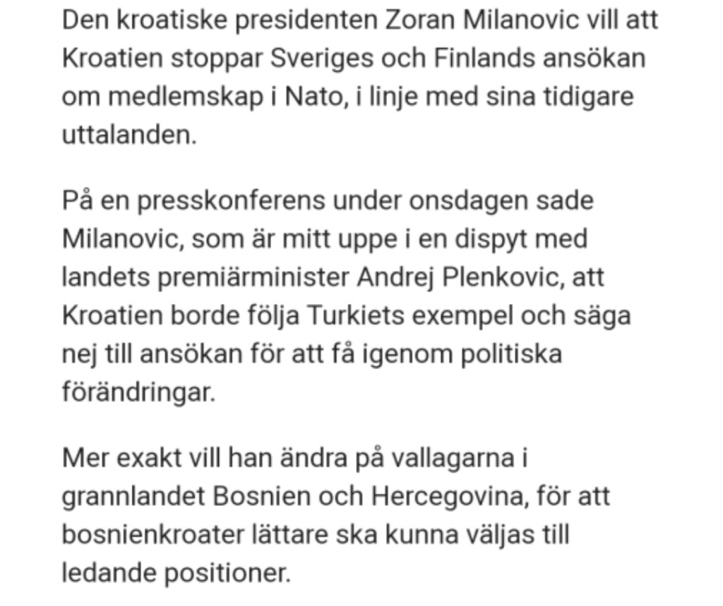 Att Turkiet satt käppar i hjulet för förhandlingarna är glädjande, även om det finns en överhängande risk att Erdogan ger med sig om Turkiets många krav tillmötesgås. Men gör man det skickar man en tydlig signal även för andra, vilket nog är en ovälkommen utveckling. Det är dock inte bara Turkiet som inte vill godkänna Sveriges Natoansökan, även den kroatiska presidenten Zoran Milanovic vill stoppa Sverige och står fast vid sina tidigare krav på att valllagarna i Bosnien ändras som han uttryckte vid en presskonferens i dag.