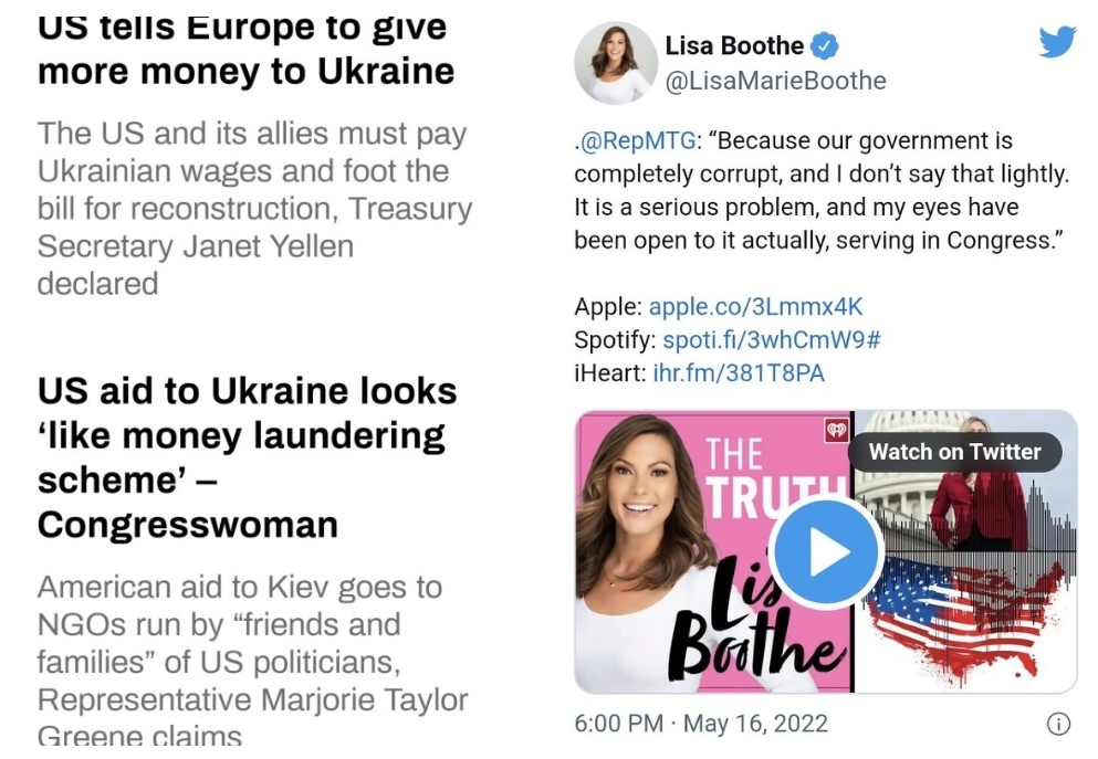 Intressant i sammanhanget är att den amerikanska kongressledamoten Marjorie Taylor Greene i en intervju deklarerat att det ekonomiska stödet som USA ger till Ukraina ser väldigt mycket ut som ett ”penningtvättsupplägg”. Pengarna som påstås vara avsedda för ukrainare hamnar i fickorna på icke-vinstdrivande och icke-statliga organisationer som ofta drivs av människor nära politikerna i USA.