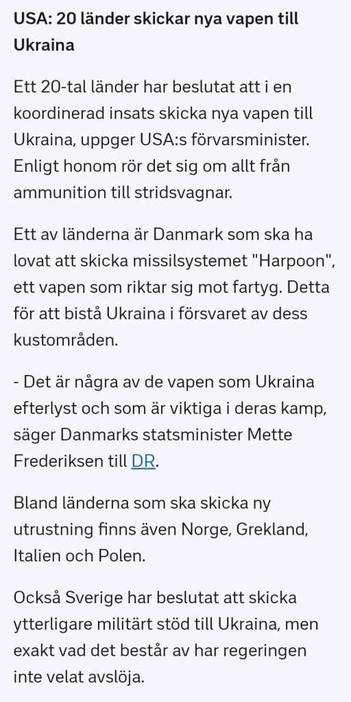 Att många tjänar stålar på att kriget i Ukraina hålls igång är redan konstaterat och i dag kom ännu ett tecken på att våra hycklande politiska ledare hellre gynnar vapenindustrin än faktiskt försöka mäkla fred i området, när ett 20-tal länder – däribland Sverige, Danmark, Norge, Grekland, Italien och Polen – beslutat att i en koordinerad insats skicka nya vapen till Ukraina i form av allt från ammunition till stridsvagnar.