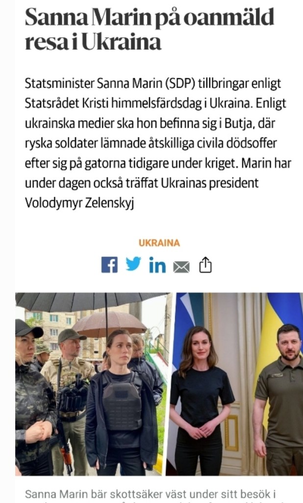 Nu senast är det Finlands statsminister Sanna Marin som söker personlig PR och genomför ett oaviserat besök i landet, där även hon nu kan stoltsera med ett idolfoto med Zelenskyj. Då väntar vi bara på att vår svenska motsvarighet Magdalena Andersson ska dyka upp i landet med skottsäker väst och vinka till kamerorna, då vi verkar ha svårt att stå på egna ben i det här landet, vilket inte minst visat sig i den ofrivilliga Natoprocessen där vi måste följa Finland likt en svans.