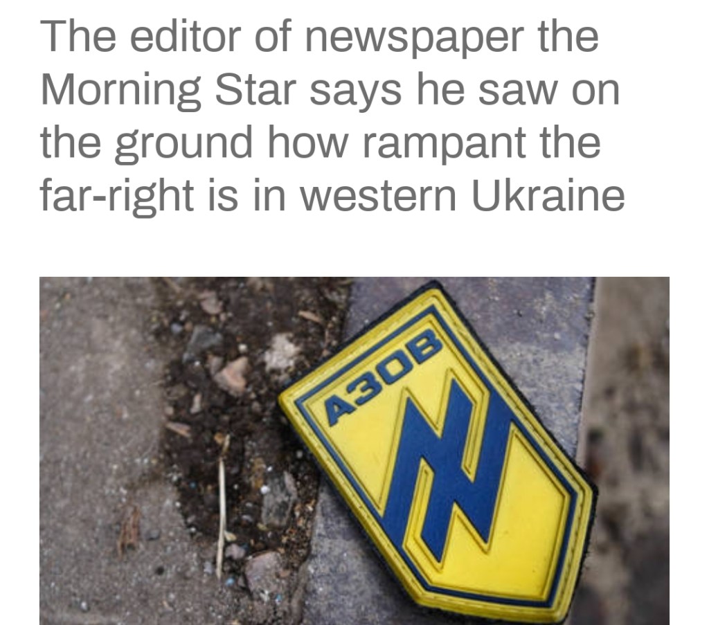 -”Du har Times, Telegraph, Guardian, BBC, Sky News och Channel 4 som verkligen producerar identiska rapporter från Kiev och Lvov som inte alls avviker varken från regeringslinjen eller Natos linje om vad som händer i Ukrainas konflikt med Ryssland. En stor ansträngning görs för att verkligen vittvätta eller rehabilitera Azovbataljonen som om den antingen inte har något inflytande i Ukraina eller helt enkelt består av missförstådda nationalister.”
