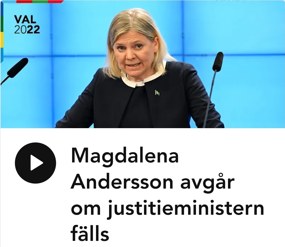 Magdalena Anderssons uttalande om att hon avgår om Morgan Johansson blir fälld, visar inte på något annat än att hon är en svag ledare. En stark ledare hade dessutom för länge sedan sett att Johansson inte är kapabel att utföra ett så viktigt uppdrag, och tillsatt någon annan som justitieminister sen lång tid tillbaka. Här visar det återigen att dom inte tar sitt uppdrag att föra Sverige på ett seriöst och frofessionellt sett, utan ser det mer som en lekstuga att leka i. Dessutom undrar jag återigen varför riksdagsledamöter skall få förtidspension när dom har misskött sig. Låt dessa åbäken köpa sig ett åk-kort så att dom likt oss vanliga döda får åka till arbetsförmedlingen och hämta A-kassa istället.