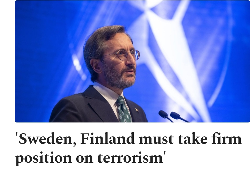 Den turkiska presidentens kommunikationsdirektör Fahrettin Altun, sade vid en paneldiskussion om Nato tidigare i dag att både Sverige och Finland måste ta konkreta steg för att ta itu med terrorism samt att deras antagning kan vara ett hot mot blockets framtid om de inte tar en tydlig ståndpunkt om kampen mot terrorism. Altun menade att det är uteslutet för Turkiet att närma sig ländernas medlemsanbud positivt om de inte tar en tillräckligt bestämd ställning mot terroristorganisationen, med hänvisning till PKK.