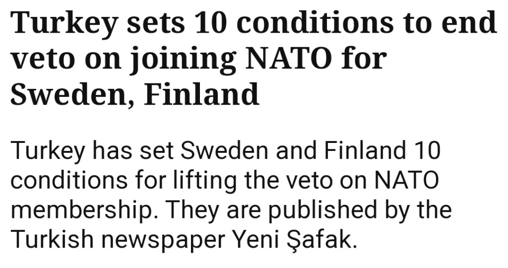 Turkiets tio krav för att häva vetot mot Sverige och Finland vad gäller Natomedlemskap har publiceras av den turkiska tidningen Yeni Şafak. Som synes är uppförsbacken rejäl och jag har väldigt svårt att se hur Sverige ska kunna ställa upp på det här. Gårdagens fadäs där den svenska regeringen allierade sig med kurdvänliga Kakabaveh lär dessutom ligga oss i fatet.