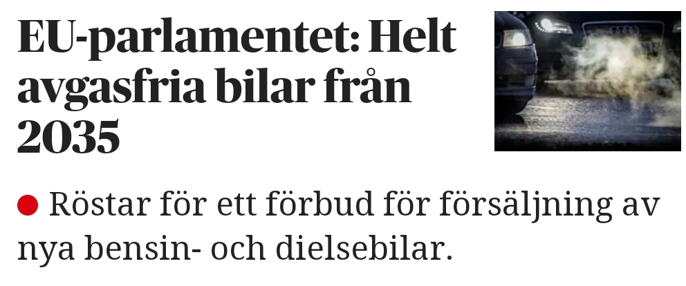 EU-parlamentet fortsätter enträget att sträva mot sitt mål att genomföra ”The green deal” till vilket pris som helst och vi betalar. I dag beslutades det att förbjuda försäljning av bensin- och dieselbilar inom EU från 2035.