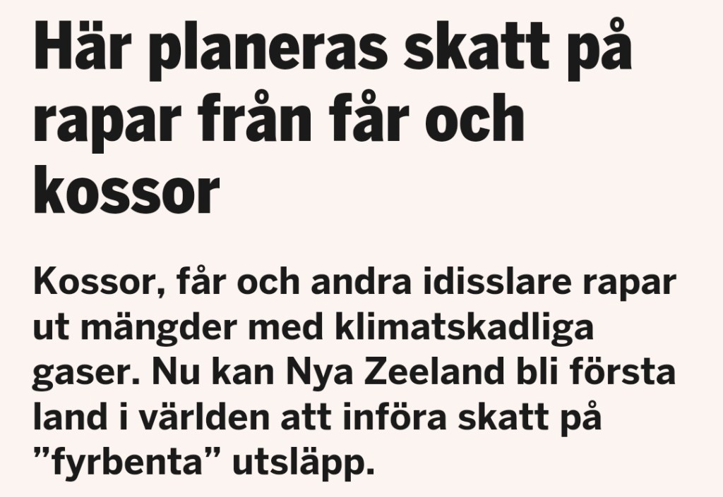 Egentligen borde man inte bli förvånad över att Nya Zeeland vill suga ut bönderna i klimathysterins namn eftersom det redan finns ansiktsmasker för kor som ska släppa ut mindre metangas för att bekämpa klimatförändringarna och bönder i Sverige deltager i försök med att blanda ut kornas foder med alger för att minska deras ”skadliga” pruttar. (https://jennypiper.blog/2022/05/28/komasker-klimatgalenskaperna-har-ingen-ande/)
