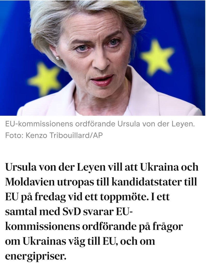 EU:s maktelit med Ursula von der Leyen i bräschen lobbar som bekant stenhårt för att få med Ukraina i unionen och i en intervju med SvD säger von der Leyen att hon vill att Ukraina samt Moldavien utropas till kandidatstater till EU på fredagens toppmöte.