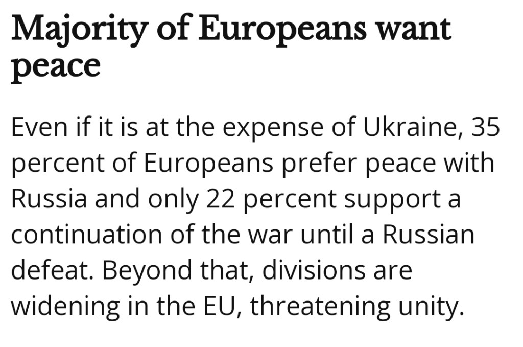Till skillnad från EU:s maktgalna ledare vill däremot det europeiska folket ha fred framför fortsatt krig. Enligt en undersökning av European Council on Foreign Relations där invånare i Storbritannien, Finland, Frankrike, Polen, Tyskland, Italien, Portugal, Rumänien, Spanien och Sverige tillfrågats, ville majoriteten av de tillfrågade i alla länder – med undantag för Polen – ha fred, även om det innebär territoriella eftergifter för Ukraina.