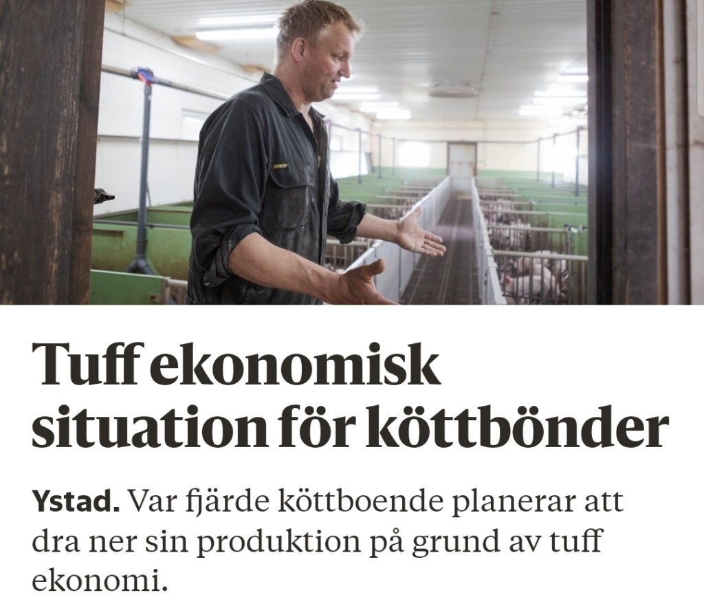 Senast i dag kan man i lokaltidningen läsa om grisbonden Henrik Nilssons nödrop om att de går på knäna på grund av den tuffa ekonomiska situationen. Enligt LRF planerar var fjärde köttbonde att dra ner på sin produktion på grund av de höga energipriserna som tvingar fram ekonomiska svårigheter för landets bönder. Även priserna på djurfoder har nått oanade höjder, vilket i slutändan drabbar bönder, slaktare samt även konsumenten som ska betala det höga priset.
