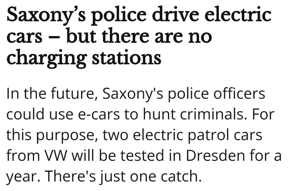 Planen att alla ska köra elbilar tycks dock inte helt genomtänkt, något som polisen i Dresden blivit varse om som testar två elpatrullbilar från VW under ett år.