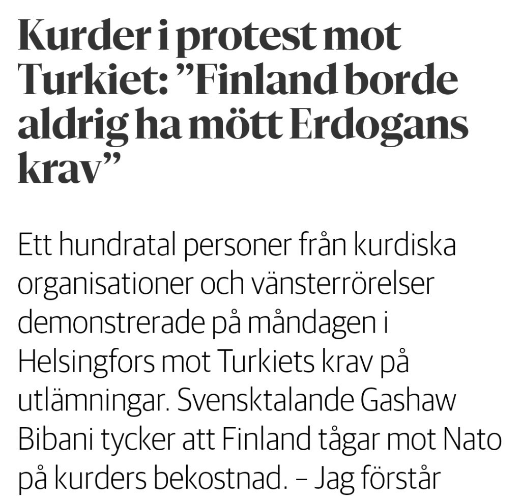 -”Utrikesminister Pekka Haavisto (Gröna) borde aldrig ha skrivit under överenskommelsen. Det försvagar kurdernas politiska ställning avsevärt. Vi talar om ett avtal som är farligt för 30–40 miljoner kurder som bor i det autonoma området i norra Syrien, Rojava, och för 15–16.000 kurder i Finland. Vi känner ännu inte till vidden av överenskommelsen, men vi vet att ett av de tio konkreta stegen Finland måste ta är att ha en så kallad mekanism med Turkiet som innebär att Skyddspolisen i Finland, Säkerhetspolisen i Sverige och underrättelsetjänsten MIT i Turkiet samarbetar och delar uppgifter. Sedan har vi politiska flyktingar här i Finland som flytt just MIT. Nu jobbar Migri med dem för att kunna deportera kurder. Hallå, det här är politiska flyktingar! Vad är det vi håller på med på riktigt? Vi är inte här för att framstå som martyrer. Vi kräver bara frihet och att kriget mot kurder slutar. Vart 20:e år görs något avtal som berör oss och som försvagar vår politiska ställning utan att en enda kurd är med och bestämmer. Så har det varit i mer än 100 år. Vi ses inte som människor. Vi har inga rättigheter. Och allra minst har vi representation. Kurdfrågan borde inte tas upp mellan Finland, Sverige och Turkiet. Det här är en stor fråga som ingen besvarat. Varför måste Finland ta ställning i ett trilateralt kontrakt för att gå med i Nato? Och varför representerade ingen Inrikesministeriet, Skyddspolisen eller Migrationsverket när det skrevs under?”