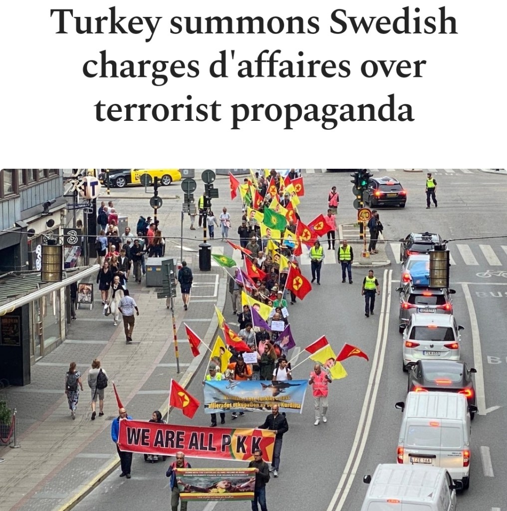 Demonstrationerna till stöd för de enligt Turkiet terrorklassificerade organisationerna PKK/PYD/YPG fortsätter i Sverige och den 21 juli gick ett demonstrationståg genom Stockholm (Göteborg enligt turkisk media) som fått Turkiet att se rött och uttrycka en kraftig reaktion på terroristpropagandan. I dag kallade Turkiets utrikesdepartement således upp en svensk diplomat i Turkiets huvudstad Ankara för möte.