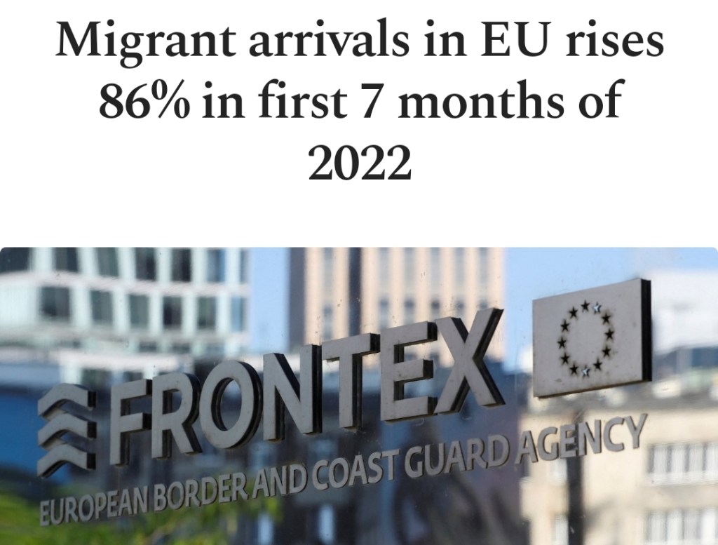 Enligt Frontex uppgifter har det skett en ökning med 86% av antalet migranter i EU under de första sju månaderna 2022 jämfört med samma period förra året. Bara i juli ökade antalet med 63% till 34.570 jämfört med föregående år.