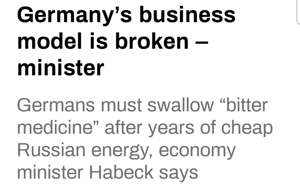 Intressant att Tysklands förestående ekonomiska kollaps som de själva orsakat skylls på Ryssland. Snart kommer vintern, återstår att se om den tyska regimen och EU-eliten är lika ignoranta då om folket börjar säga ifrån. Det är lätt för dessa korrupta politiker inom EU att stå och ljuga utan att behöva stå till svars för sina misstag, men folket som inte blivit tillfrågade borde se till att avsätta alla dessa styrda politiker vars ideologi inte värnar om mänskligheten. Så kommer folket vakna i tid? Inte i Sverige i alla fall.