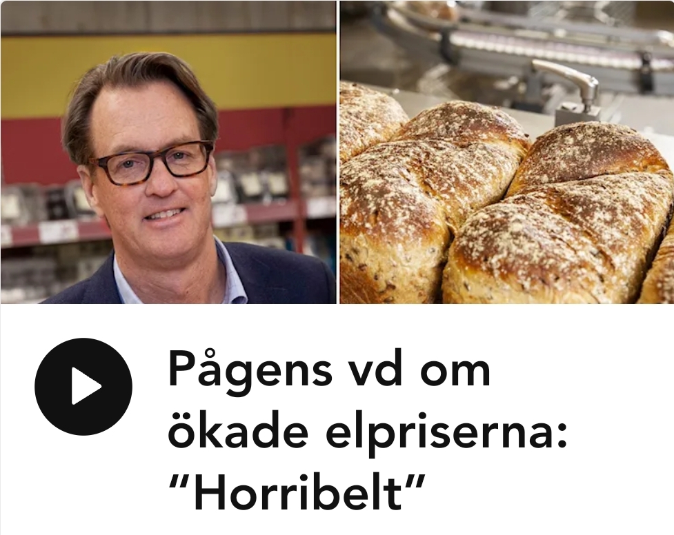 Anders Carlsson Jerndal, VD på bageriföretaget Pågen, säger att det är helt horribelt att det här kan ske i ett välutvecklat land som Sverige. Företagets kostnader för energiförsörjningen har femdubblats sedan i höstas och de ökade elpriserna slår igenom på företagets lönsamhet samt tvingar dem att höja priserna.