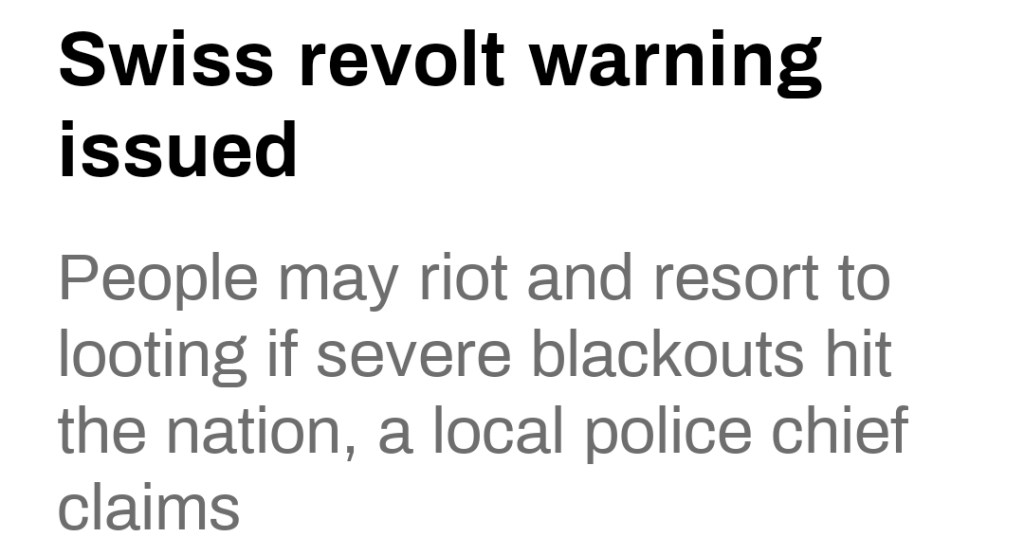 Det så kallade neutrala Schweiz valde ändå att deltaga i sanktionerna mot Ryssland och drabbas nu tillsammans med EU av elkrisen. Enligt polischefen för en av landets kantoner befarar man att schweizare kan göra uppror och ta till plundring om nationen drabbas av en allvarlig energikris i vinter. Även Fredy Fassler, chef för säkerhets- och justitiedepartementet i kantonen St. Gallen, har uttalat sig om att ett strömavbrott skulle få ”långtgående konsekvenser”.