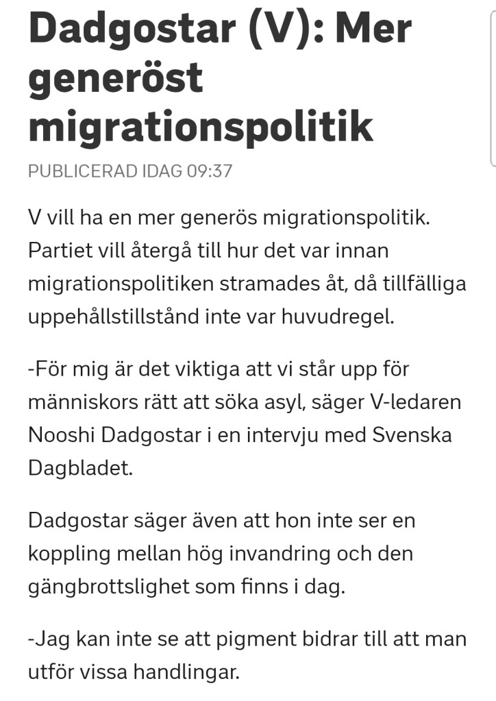 Att Sverige i decennier agerat humanitär stormakt och nu får betala priset för den såväl oansvariga som kravlösa politik som bedrivits av majoriteten av riksdagspartierna är så klart irrelevant i sammanhanget och Dadgostar pressas så klart inte kring detta faktum eftersom svensk massmedia av tradition hellre stryker makthavarna medhårs istället för att ställa dem mot väggen.