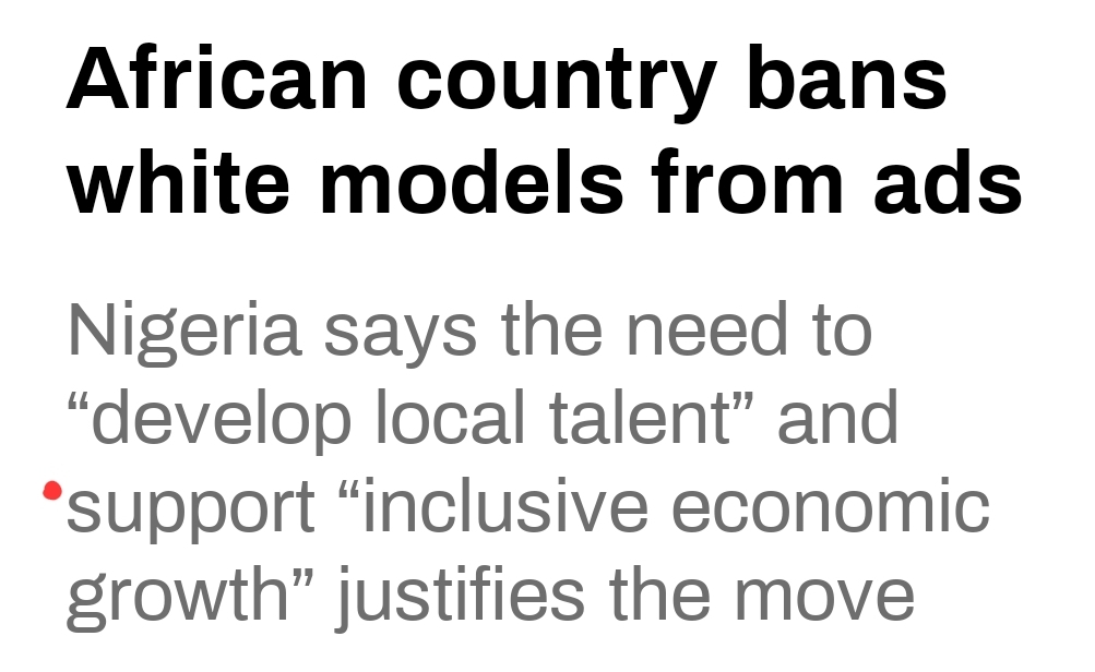 När jag först såg rubriken ”Nigeria förbjuder vita modeller” var min första tanke att det var ett rasistiskt beslut, men när man tagit del av deras resonemang förstår man bättre hur de kommit fram till det beslutet. Dessutom förbjuder de inte vita modeller, utan det handlar om utlänningar vs. nigerianer, där man främst vill ta tillvara på lokala förmågor och stödja sina egna medborgare.